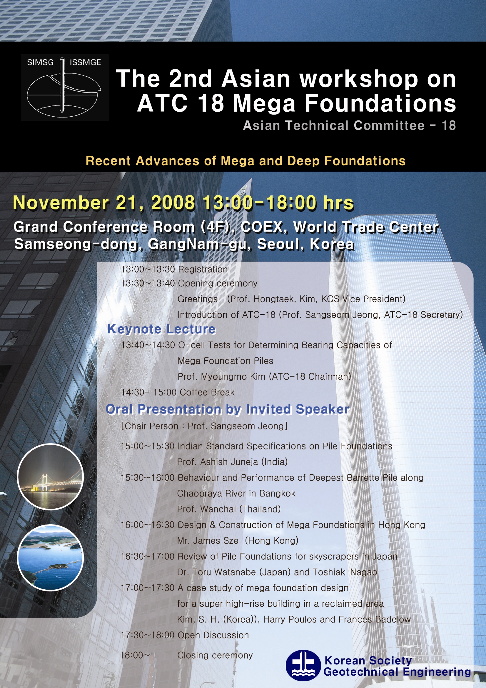 기초기술위원회와 공동으로 개최하는 ATC-18 워크샾을 다음과 같이 개최할 예정입니다. 많은 참여 부탁드립니다. - 다 음 - 일 시 : 11월 21일(금) 13:00 ~ 18:00 장 소 : 코엑스 세계무역센터4층 그랜드 컨퍼런스룸 등 록 : 등록비 무료, 교재비 20,000원 당일 워크샵 등록 시 건설교통연구개발사업 연구과제 “LRFD 기초구조물 설계를 위한 저항계수 결정 연구”의 최종보고서를 함께 배포할 예정이오니 회원여러분들의 많은 참여바랍니다. ※자세한 사항은 첨부파일을 참고해 주시기 바랍니다.