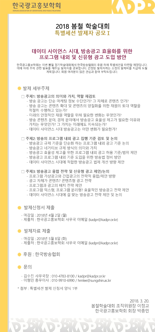 [KADPR] 2018 봄철학술대회 특별세션 I 발제자 공모 (데이터 사이언스 시대, 방송광고 효율화를 위한 프로그램 내외 및 신유형 광고 도입 방안)