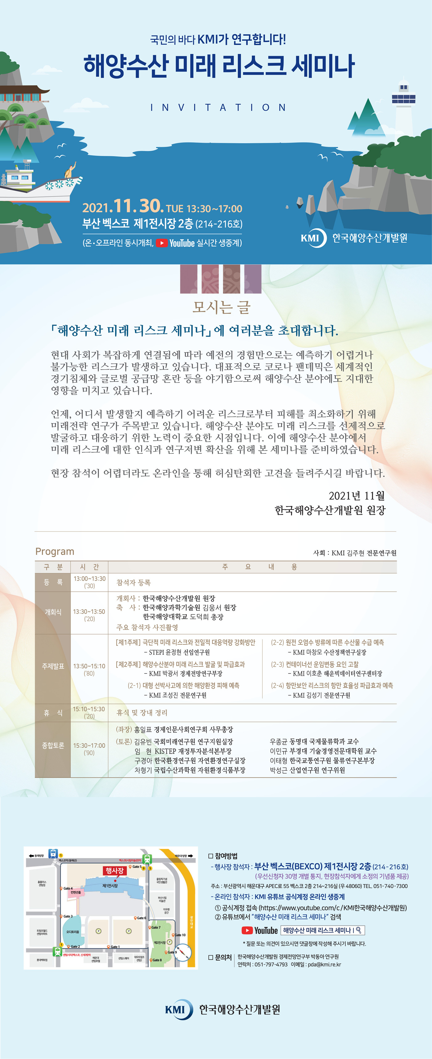 해양수산분야와 해양수산 미래 리스크에 관심이 있으신 분들의 많은 참여를 바라며, 선착순 현장 참석도 가능하오니 많은 관심 부탁드립니다.