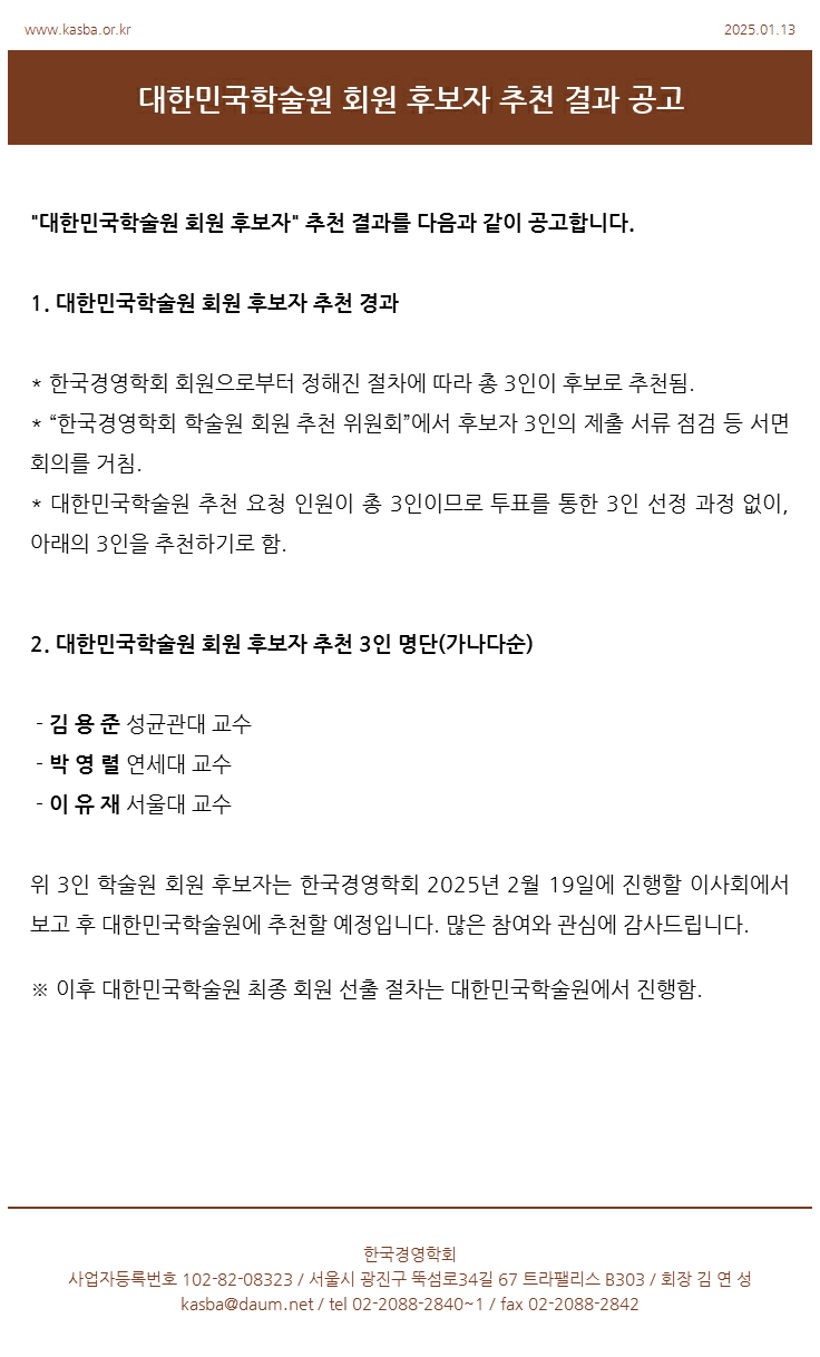 [한국경영학회] 대한민국학술원 회원 후보자 추천 결과 공고