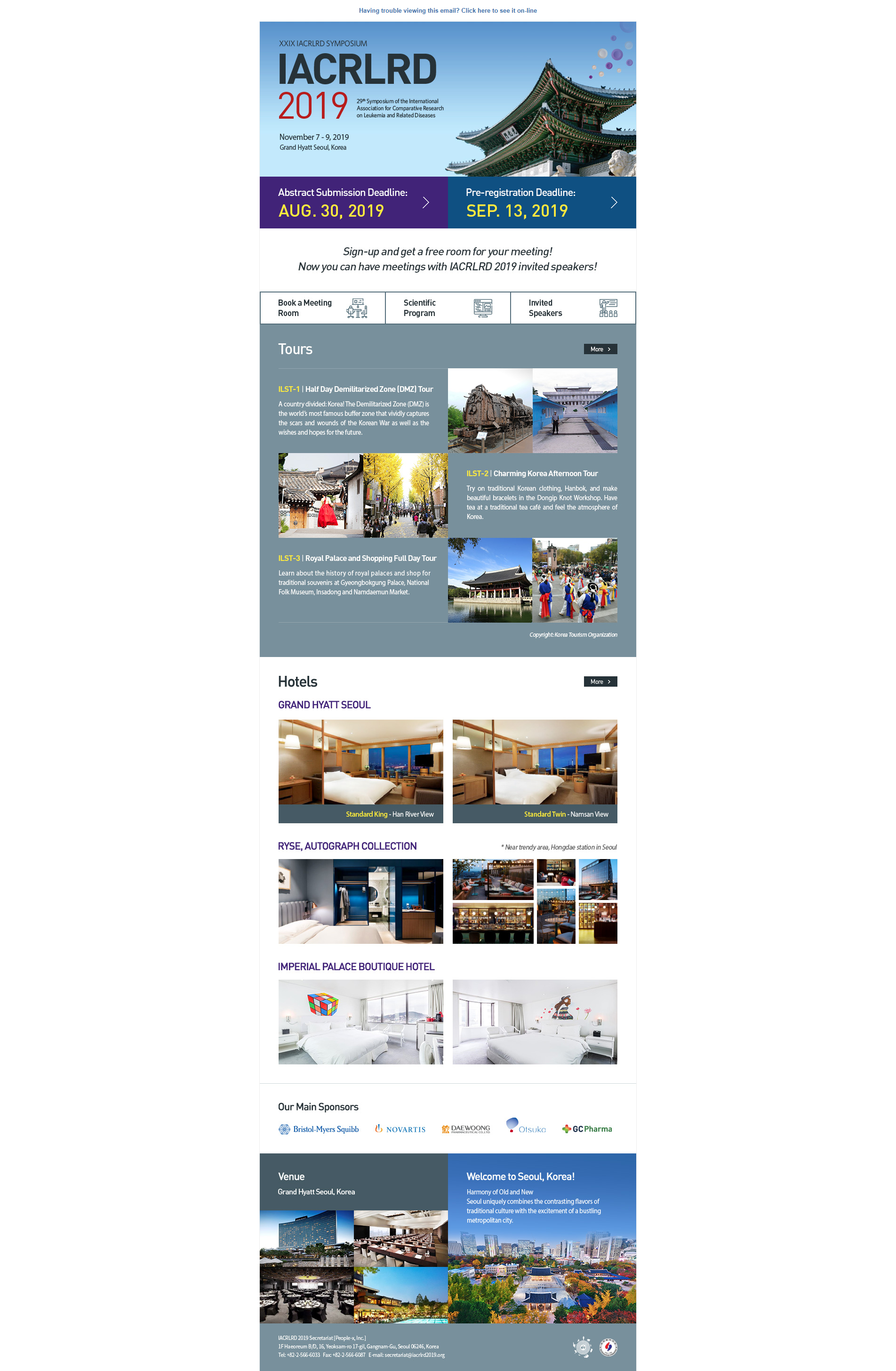 대한혈액학회는 2019 11 7일부터 9일까지 그랜드 햐얏트서울 호텔에서 제29회 백혈병연관질환 국제학술대회 (29th Symposium of the International Association for Comparative Research on Leukemia and Related Diseases, IACRLRD 2019)를 개최합니다.