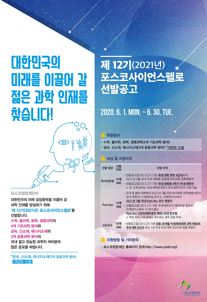 포스코청암재단이 대한민국의 미래 성장동력을 이끌어 갈 과학 인재를 양성하기 위해 ‘제 12기(2021년) 포스코사이언스펠로’를 선발합니다.