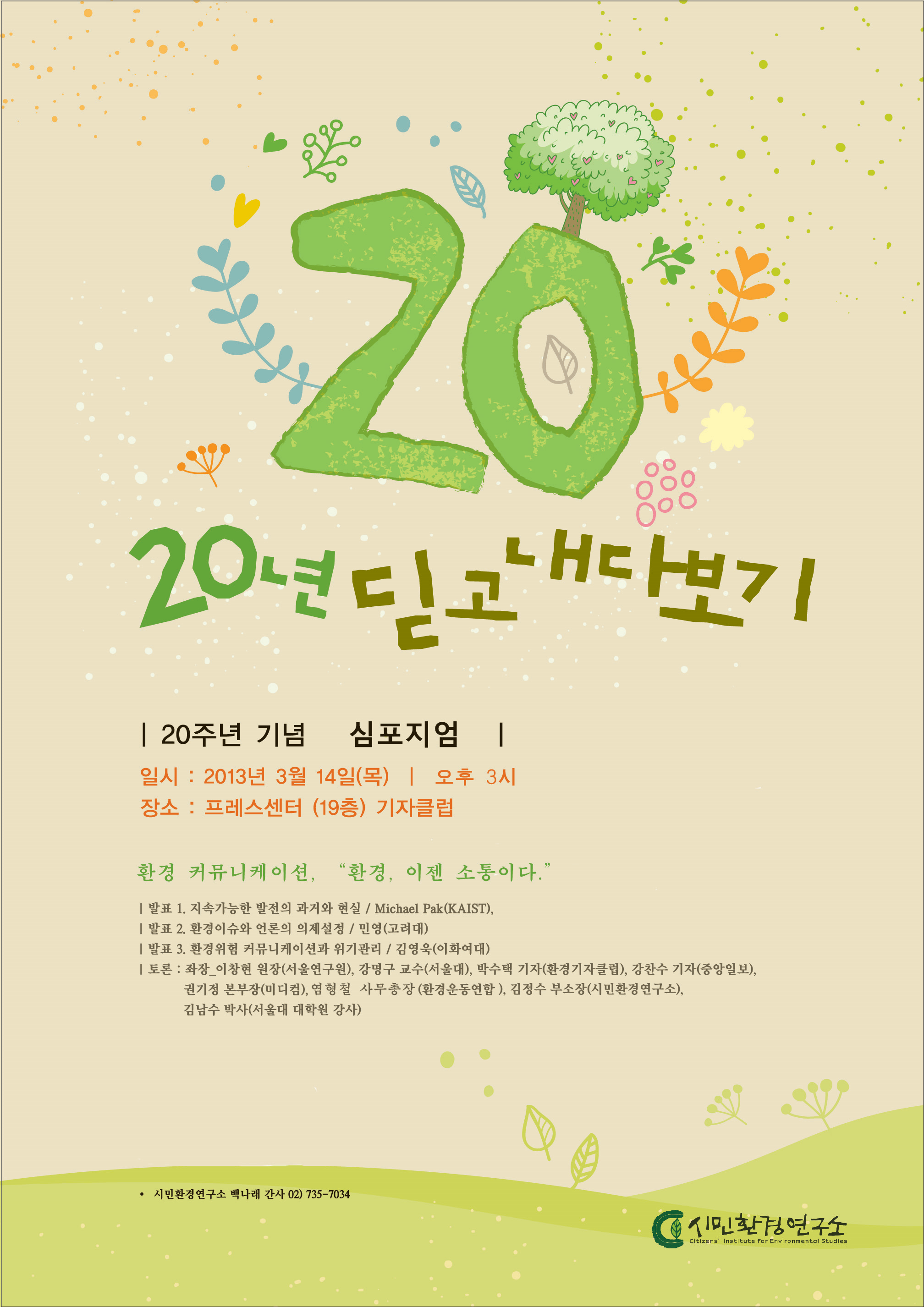 <환경 커뮤니케이션 심포지엄 안내> ■심포지엄 환경 커뮤니케이션, “환경, 이젠 소통이다.” 일시: 2013년 3월 14일(목) 오후 3시-6시 장소: 프레스센터 (19층) 기자클럽 발표1. 지속가능한 발전의 과거와 현실/Michael Pak(KAIST), 발표2. 환경이슈와 언론 의제설정/민영(고려대) 발표3. 환경위험 커뮤니케이션과 위기관리/김영욱(이화여대) 토론: 좌장-이창현 원장(서울연구원), 강명구 교수(서울대), 박수택 기자(환경기자클럽), 강찬수 기자(중앙일보), 권기정 본부장(미디컴), 염형철 사무총장(환경운동연합), 김남수 박사(서울대 대학원 강사) 김정수 부소장(시민환경연구소) 사단법인 시민환경연구소(소장 박창근)가 오는 3월 14일 환경 커뮤니케이션, ‘환경, 이젠 소통이다’라는 주제로 프레스센터 19층 기자클럽에서 심포지엄을 개최한다. 이번 심포지엄은 시민환경연구소가 창립 20주년을 맞아 연구소에서 펼쳐 온 각종 현장조사와 과학적 분석의 결과들을 대중 혹은 의사결정자들과 효과적으로 소통할 수 있는지를 모색하기 위한 자리이다. 심포지엄의 주제발표는 마이클 박, 카이스트 과학 커뮤니케이션 교수가 ‘지속가능한 발전의 과거와 현실’을, 민영 고려대 미디어학부 교수가 ‘환경이슈와 언론의제설정’을, 김영욱 이화여대 언론정보학과 교수가 ‘환경위험 커뮤니케이션과 위기관리’라는 주제로 각각 발제한다. 토론자로는 강명구 서울대 언론정보학과 교수, 박수택 환경기자클럽 회장, 강찬수 중앙일보 환경전문기자, 권기정 미디컴 본부장, 염형철 환경운동연합 사무총장, 김남수 서울대 대학원 환경교육과정 강사, 김정수 시민환경연구소 부소장이 참여하며, 좌장은 이창현 서울 연구원장이 맡게된다. 환경운동연합을 비롯한 환경 및 시민단체 활동가들은 지난 정부의 대중 및 시민사회와 환경 커뮤니케이션에 많은 한계를 느꼈고, 새로운 정부에서는 이를 효과적으로 개선할 필요가 있다는 점을 지적하며, 시민환경연구소는 ‘본 심포지엄을 통해 환경 커뮤니케이션이 언론학회나 환경관련 학회에서도 더 주목받게 되길 기대한다’고 밝혔다.