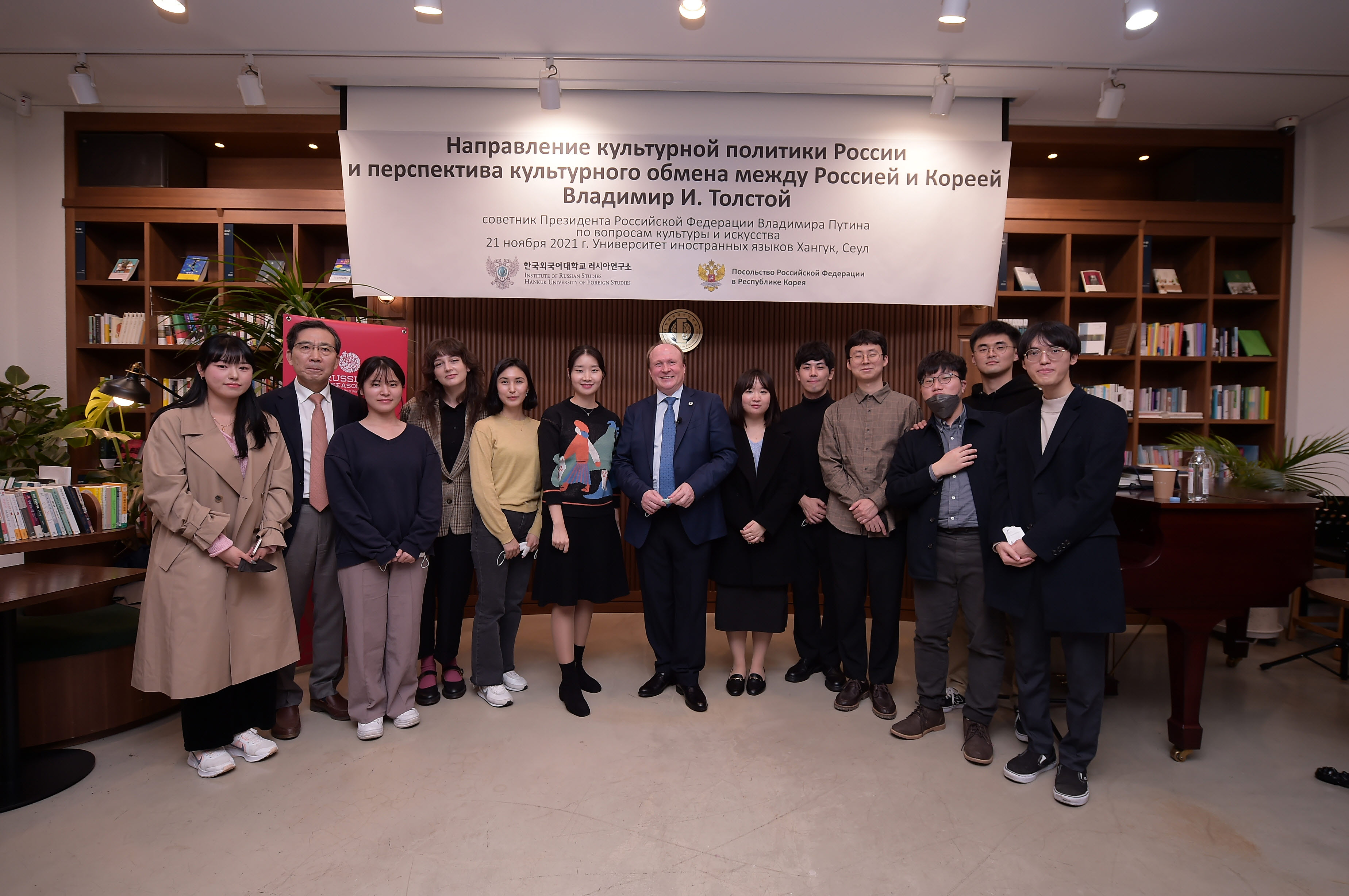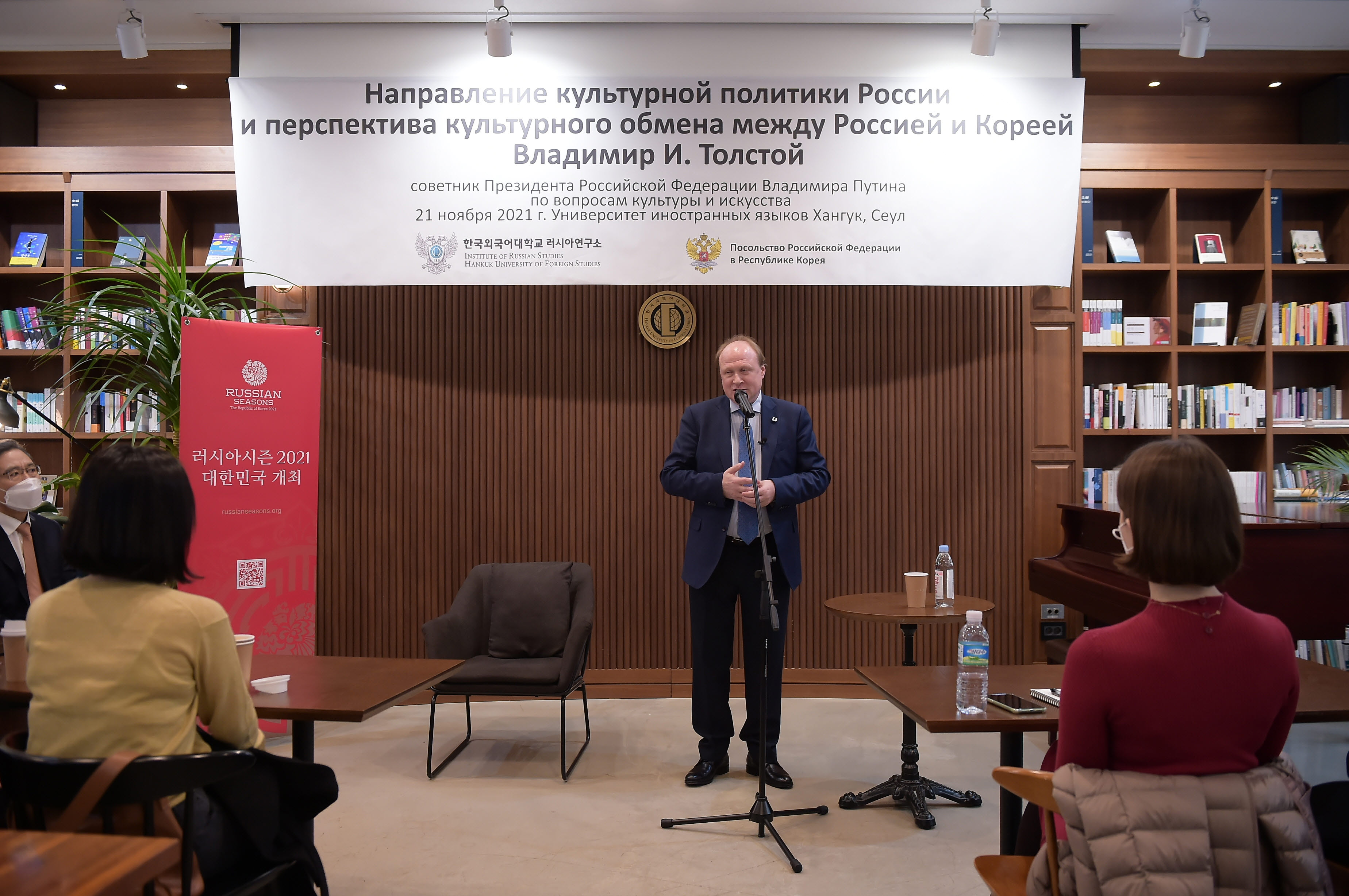 러시아연구소 (소장 표상용 )는 지난  11월  21(이문일공칠에서 러시아 대통령 문화담당 특별보좌관 블라디미르 톨스토이 (Vladimir Tolstoy)를 초청하여 제 9차 러시아연구소 포럼 (IRS Forum)을 개최했다 . “러시아 문화정책의 방향과 한 ·러 문화예술교류의 미래 라는 주제로 강연한 톨스토이 보좌관은 세계적인 대문호 레프 톨스토이의 현손이자 언론인 출신 인사로 톨스토이 영지  야스나야 폴랴나 ’ 박물관 관장 러시아박물관협회 회장을 역임하였고 현재는 러시아 문화예술 정책 결정 과정에서 중요한 역할을 담당하고 있다 .