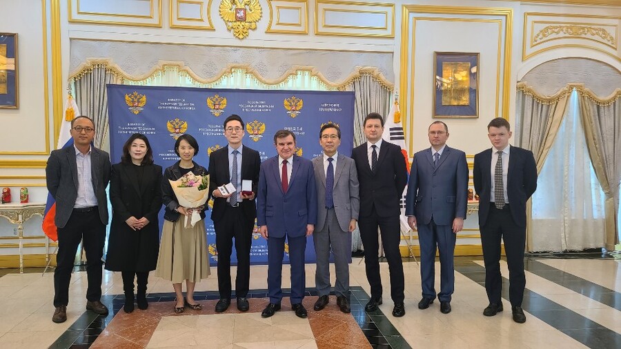 메달은 안드레이 쿨릭 주한 러시아 대사가 수여했다 .