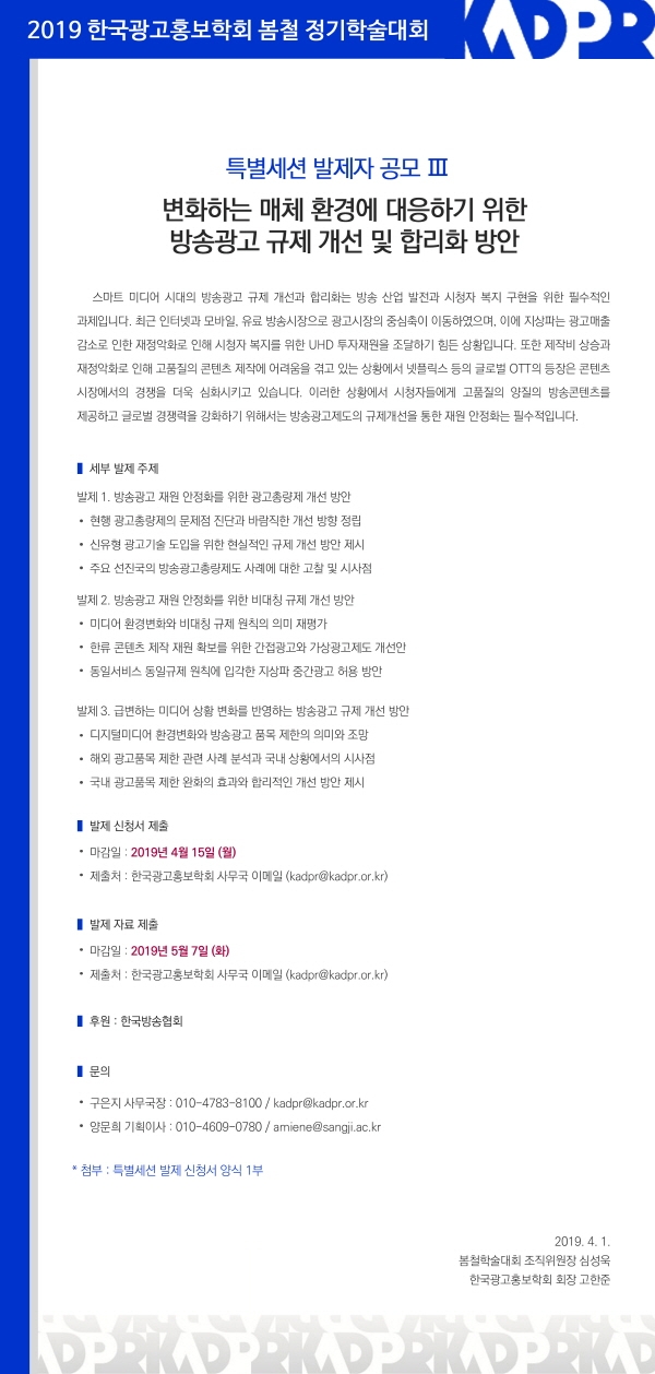 [KADPR] 2019 봄철학술대회 특별세션 Ⅲ 발제자 공모 (변화하는 매체 환경에 대응하기 위한 방송광고 규제 개선 및 합리화 방안)