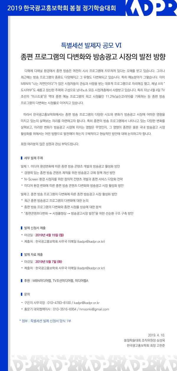 [KADPR] 2019 봄철학술대회 특별세션 Ⅵ 발제자 공모 (종편 프로그램의 다변화와 방송광고 시장의 발전 방향)