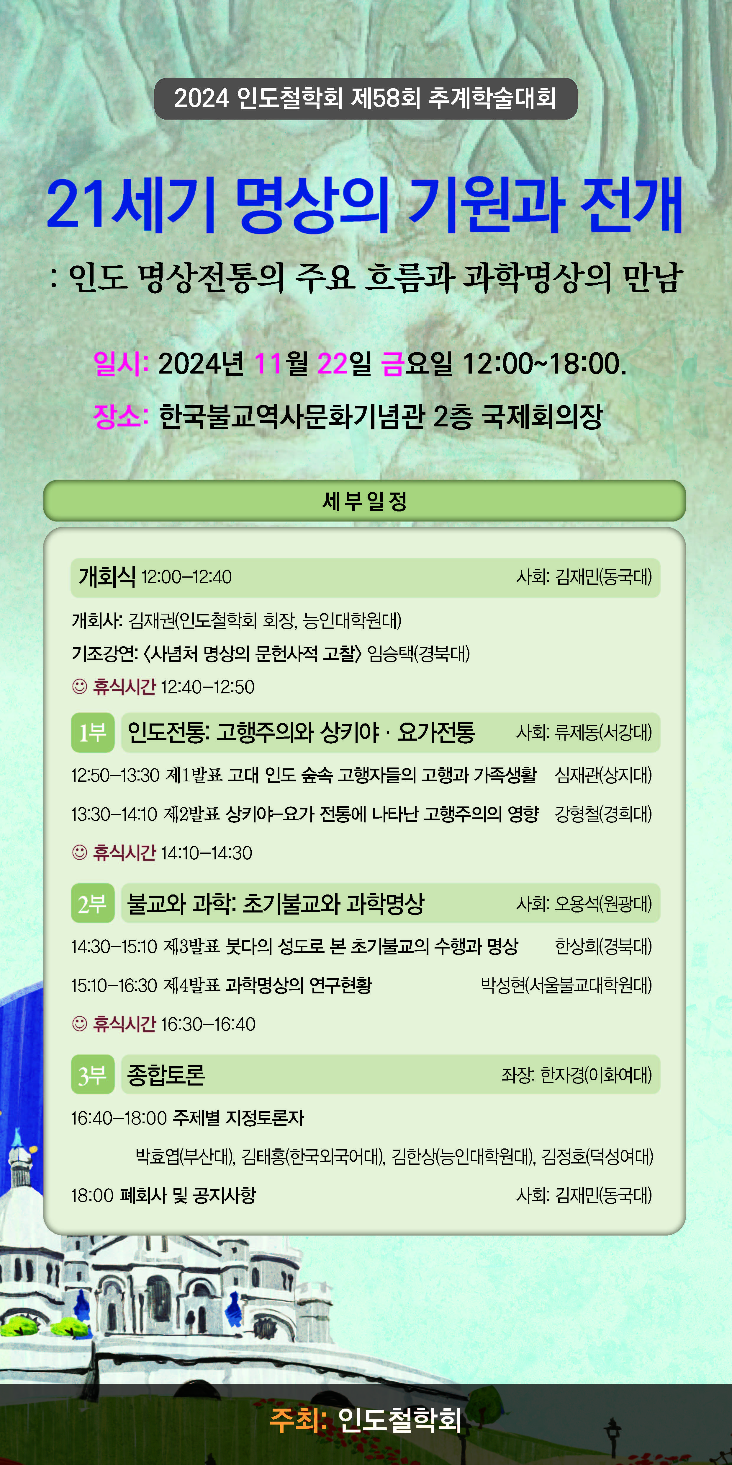 2024년 인도철학회 제58회 추계학술대회는 <21세기 명상의 기원과 전개>라는 대주제로 인도의 고전적인 수행전통에 근거한 초기 명상수행의 주요 흐름과 그 변용, 그리고 과학 명상과의 만남까지 폭넓게 다루고자 합니다.