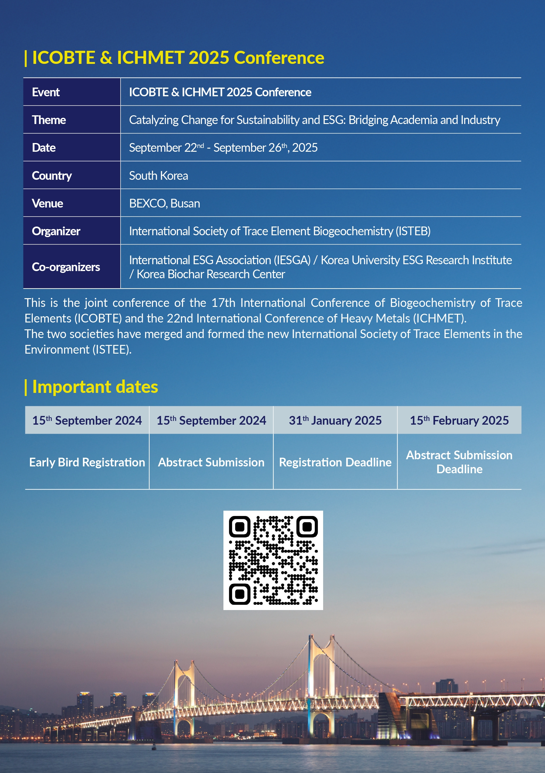 ICOBTE & ICHMET 2025는 ISTEB, 국제 ESG협회, 고려대학교 ESG 연구원, KBRC가 공동 주관하는 국제학회로, 세계 최대 규모의 미량원소 생지화학 학술대회(ICOBTE)와 환경 중 중금속 관련 학술대회(ICHMET)가 역대 두 번째로 공동 개최되는 자리입니다.
