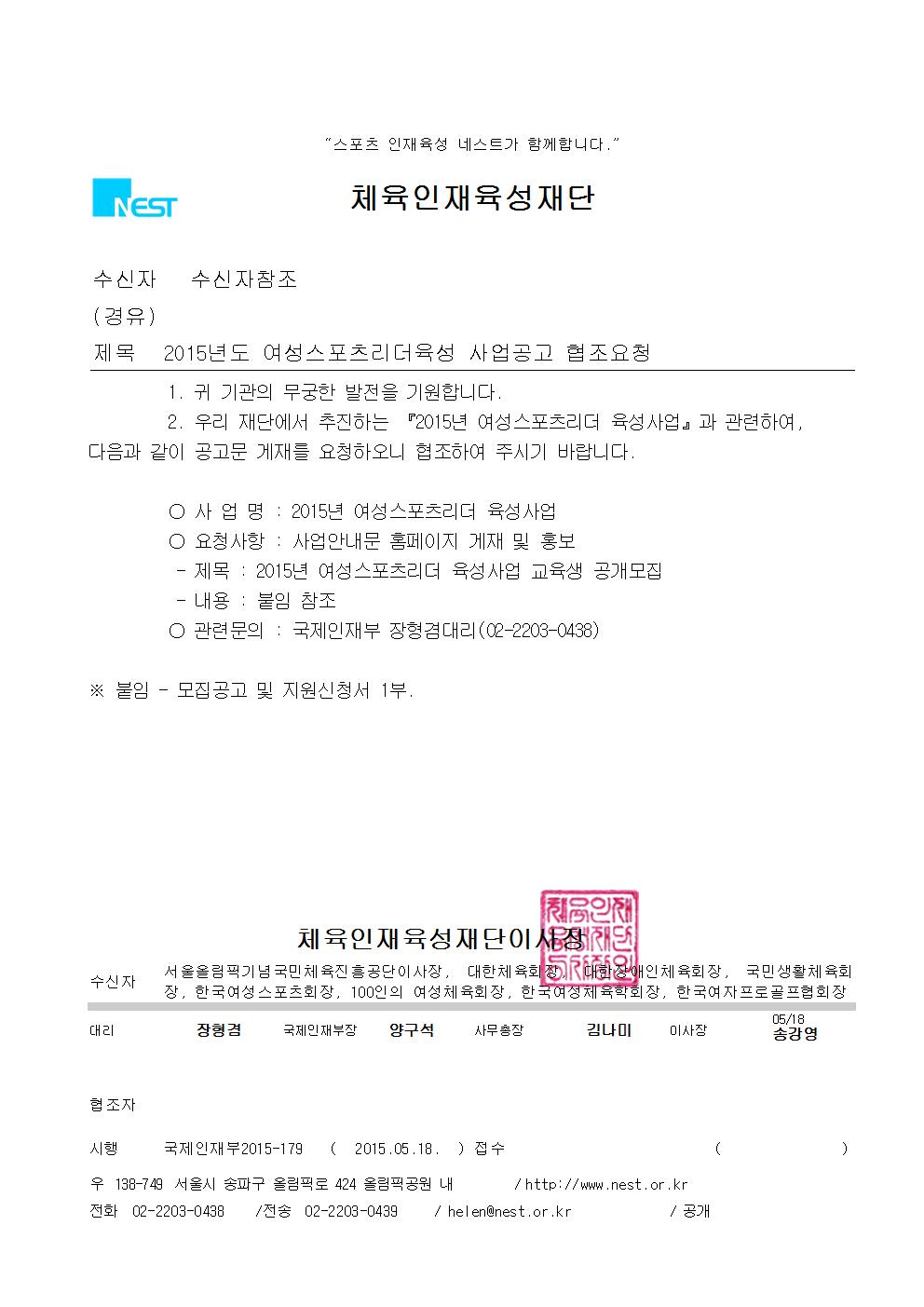 체육인재육성재단에서 추진 중인 '2015 여성스포츠리더 육성사업'의 내용을 공지합니다.