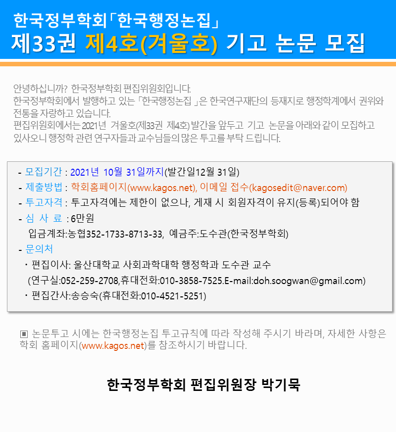 한국행정논집 33권 제4호 논문기고 안내