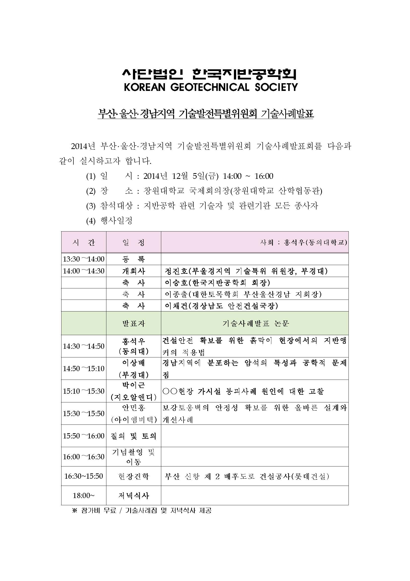 2014년 부산·울산·경남지역 기술발전특별위원회 기술사례발표회를 다음과 같이 실시하고자 합니다. 회원여러분들의 많은 관심과 참여 바랍니다.