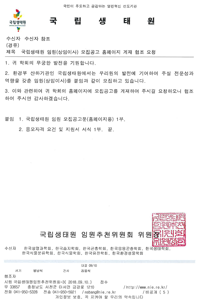 국립생태원 임원(상임이사) 모집공고 홈페이지 게재 협조 요청