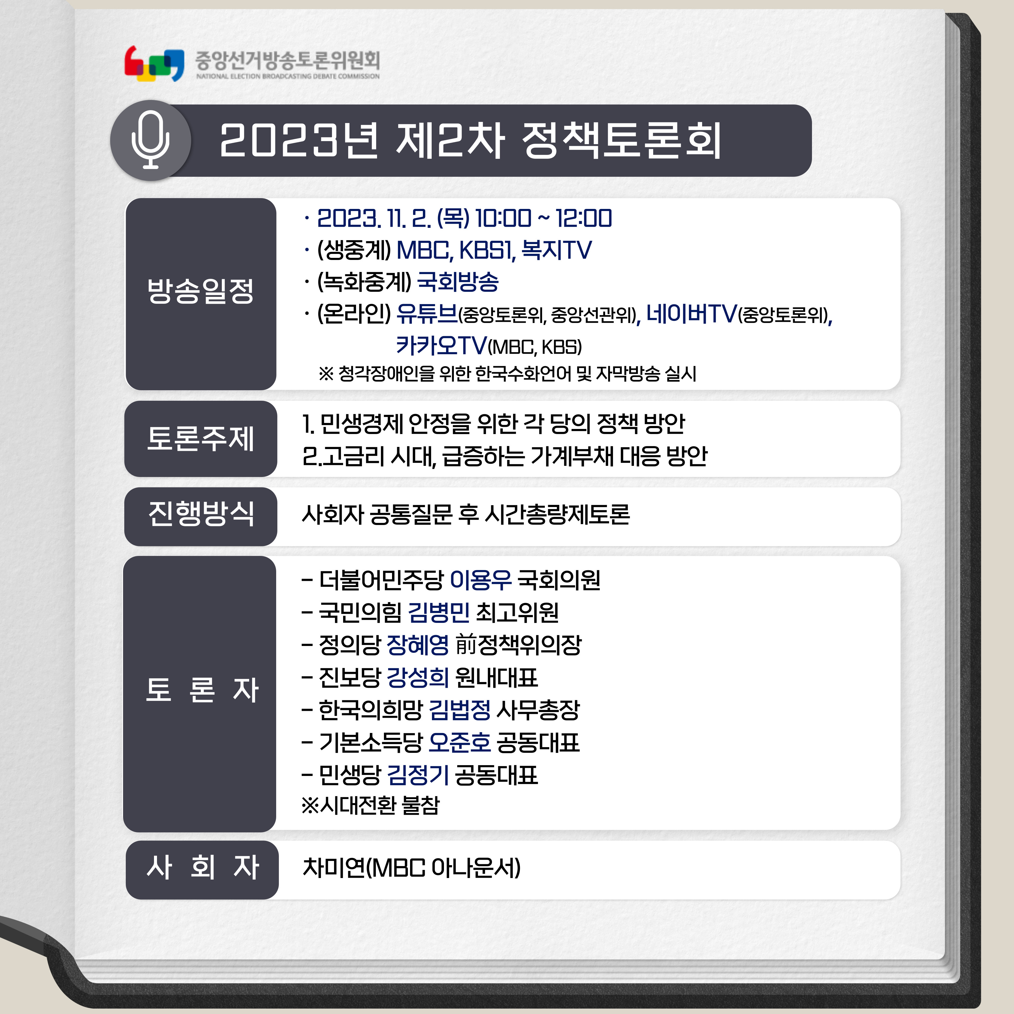 안녕하십니까? 중앙선거방송토론위원회는 2005년 12월부터「정당법」제39조에 따라 국고보조금을 받는 정당이 방송을 통하여 정강·정책을 국민들께 알릴 수 있도록 연 2회에 걸쳐 '정책토론회'를 개최하고 있습니다. 2023년 제2차 정책토론회는 오는 11월 2일(목) 오전 10시~12시까지 120분 동안 MBC와 KBS1 등의 채널을 통해 전국에 생중계됩니다. 7개 정당이 한자리에 모여 ‘민생경제 안정을 위한 각 당의 정책 방안’과 ‘고금리 시대, 급증하는 가계부채 대응 방안’을 주제로 토론을 벌일 예정이오니, 귀 기관의 관심 있는 분들이 시청하실 수 있도록 누리집 등을 통해 많은 홍보 부탁드립니다.