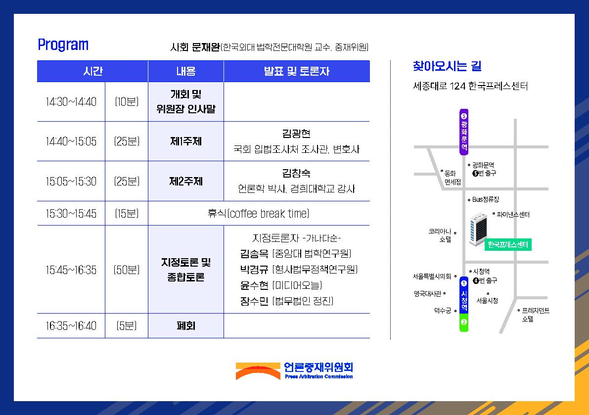 * 참석을 희망하시는 분들께서는 사전 좌석 세팅 등을 위하여 언론중재위원회 연구팀(02-397-3041~4)로 사전에 연락 주시면 감사하겠습니다.