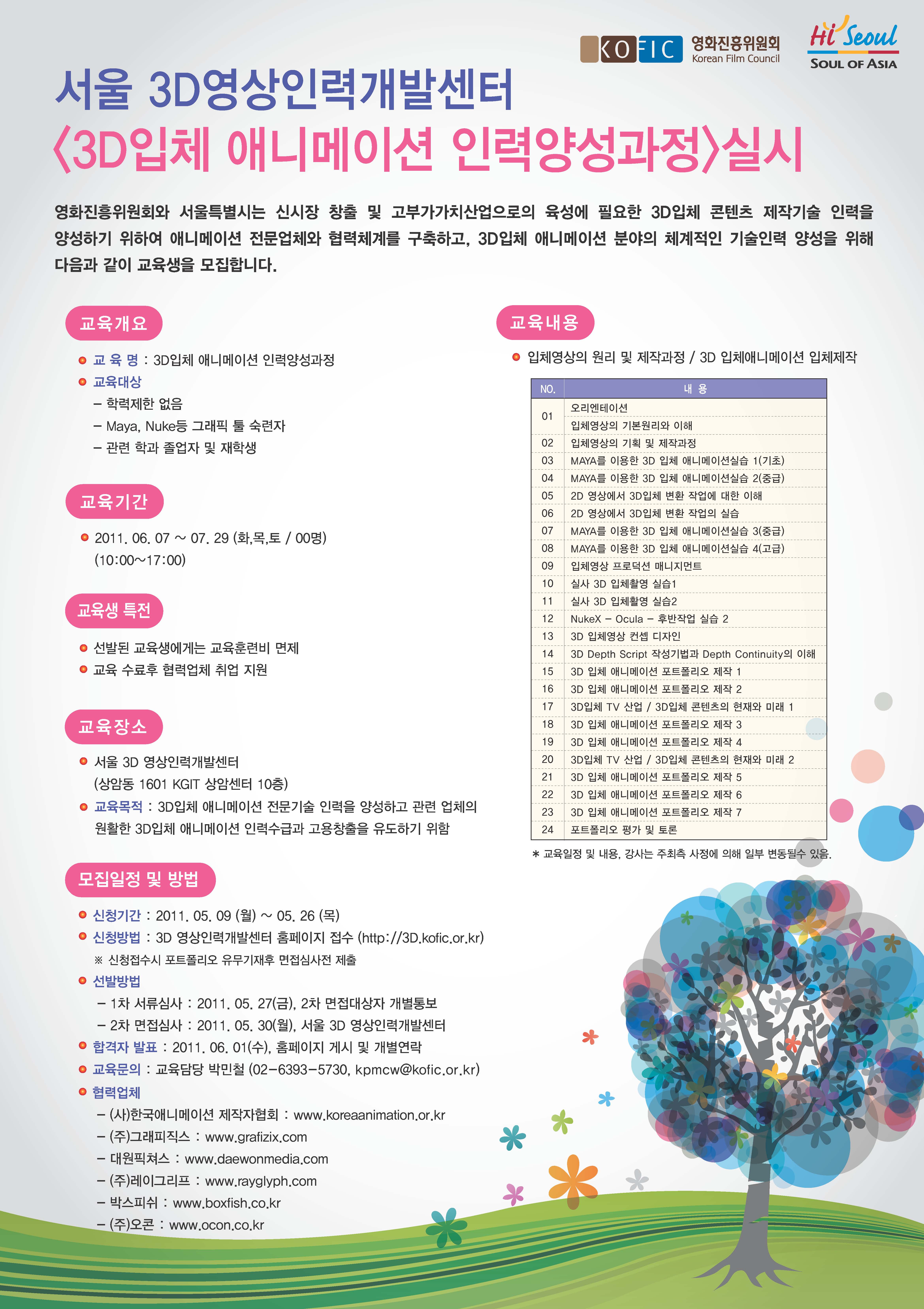 영화진흥위원회와 서울특별시는 신시장 창출 및 고부가가치 산업으로서의 육성에 필요한 3D입체 콘텐츠 제작기술 인력을 양성하기 위하여 애니메이션 전문업체와 협력체계를 구축하고, 3D입체 애니메이션 분야의 체계적인 기술인력 양성을 위해 다음과 같이 교육생을 모집합니다.