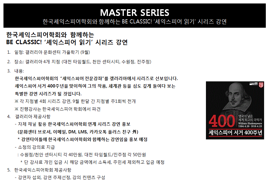 갤러리아 백화점에서 학회에 의뢰한 셰익스피어 강연 안내입니다. 9월-10월 초까지 4강으로 수원점, 천안점, 대전 타임월드, 진주점에서 동시 진행됩니다. 저희 학회에서는 1강 셰익스피어 오리엔테이션 2강 셰익스피어 비극의 세계 3강 셰익스피어 희극의 세계 4강 셰익스피어 로맨스 혹은 사극의 세계 로 구성하였습니다. 자세한 내용은 첨부한 파일을 참고하시기 바랍니다.